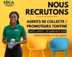 Dans le cadre du renforcement de ses activités, la Coopérative d’Epargne et de Crédit des Artisans (CECA) recrute pour ses agences et guichets, des Agents de collecte promoteurs tontine répondant au profil suivant : Avoir au moins le BEPC Avoir une capacité suffisante de communication, une bonne moralité et un relationnel aisé Avoir une expérience dans le domaine commercial Résider dans les quartiers suivants : Akodessewa, Nukafu, Grand Marché, Kodjoviakopé Casablanca et environs DOSSIER A FOURNIR Une lettre de motivation adressée au Directeur Général de la CECA Un curriculum vitae actualisé Une…